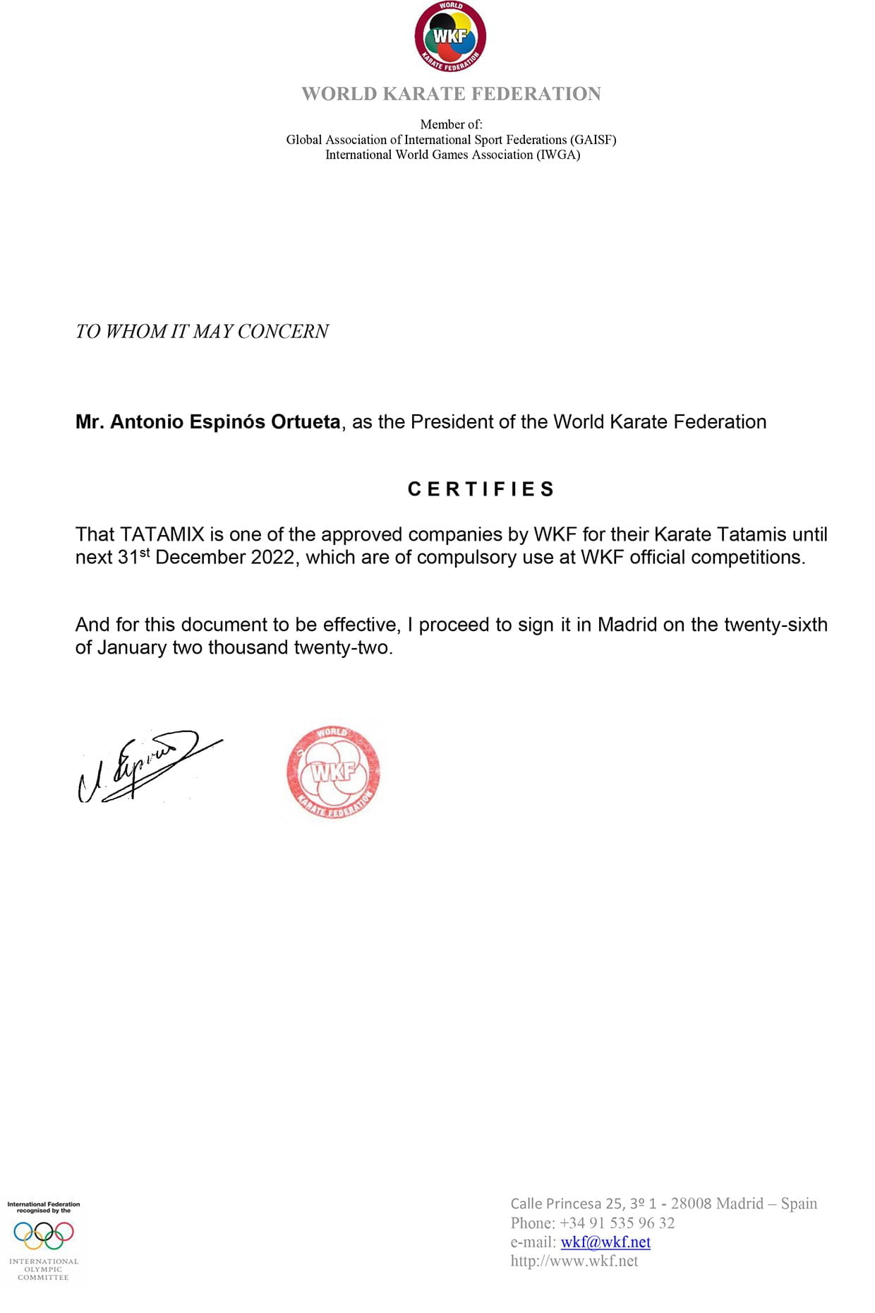 Product in cross-linked polyethylene foam with technical characteristics designed to meet the requirements of the WKF (World Karate Federation). Elasticity, firmness and good adhesion, provide quality to the product, for the best use in WKF events at international level. Frames to close the perimeter area, including Shut off water. WKF logo brand LASER USE: Specific for national and international Karate competitions