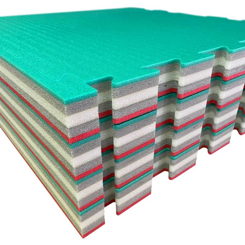 Made of closed-cell cross-linked polyethylene foam, it is coupled with a density mixture to obtain strong impact absorption. E 'made by means of water jet cutting, in a special locking system that makes it reversible. The product includes the perimeter frames for the arrival area. The “rice straw” non-slip surface effect. »